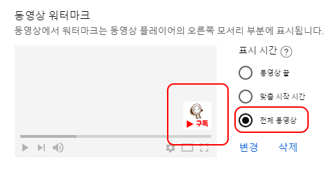 2. 구독 버튼 아이콘 변경하고 전체 동영상에 나오도록 설정하기