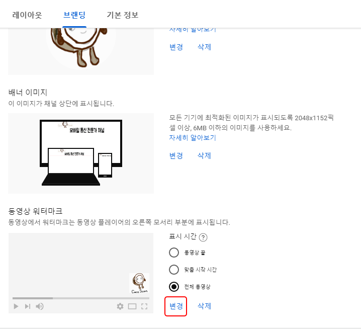 (6) 만일 유튜브 워터마크를 없애기를 원하면 위에서 "삭제" 클릭하면 됨