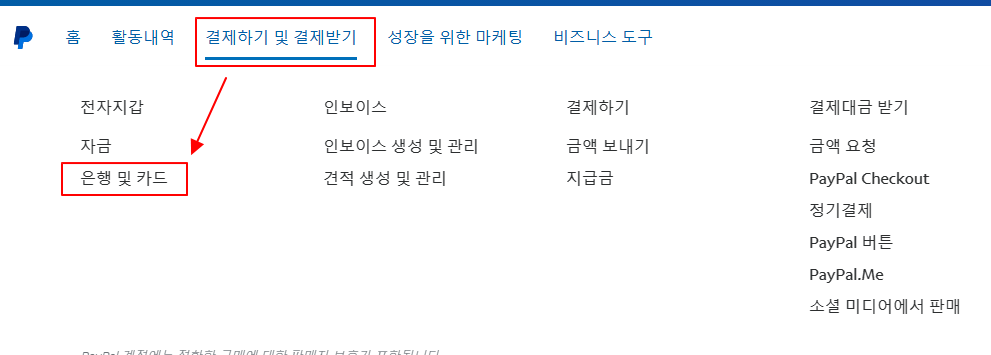(1) 페이팔 메인화면 상단에 '결제하기 및 결제받기' 탭 클릭하기