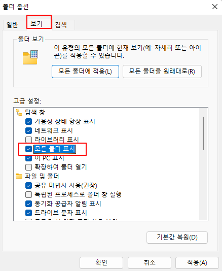 (5) '모든 폴더 표시' 체크하고 아래에 '확인' 버튼 클릭하기