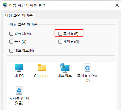 (1) 휴지통을 클릭해 휴지통 체크 해지하기
