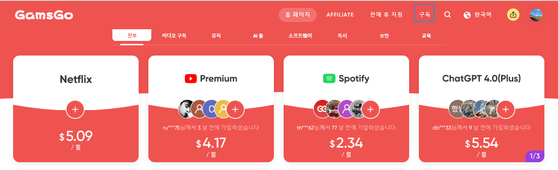 (1) 겜스고 공식 사이트 접속: 겜스고 공식 사이트에 방문하여 ChatGPT Plus를 선택합니다.