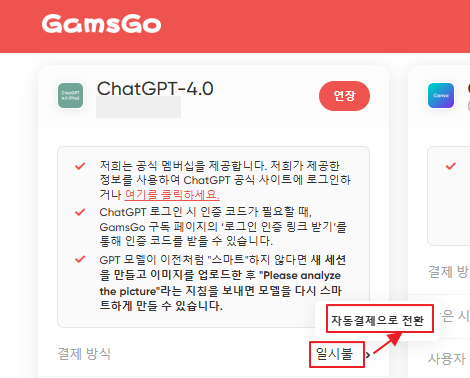 5. 겜스고 자동결제 / 추후결재(일시불) 변경하는 방법