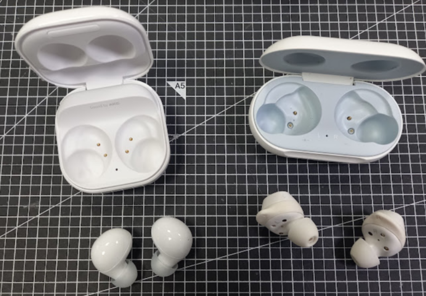 - 왼쪽이 갤럭시 Buds2이며 오른쪽이 갤럭시 Buds이다.