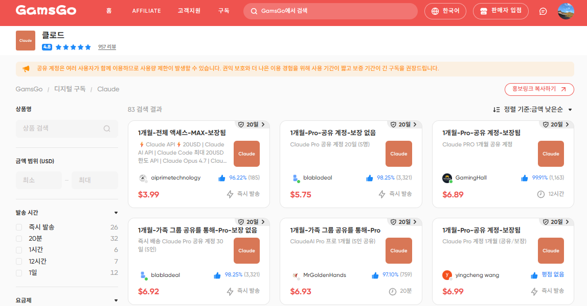 | "보증 없음"으로 구독하시면 계정 전달시 정상 사용만 보증하며 이후 지원 또는 교체가 되지 않습니다. 구독하실 때 잘 확인해야 합니다. |