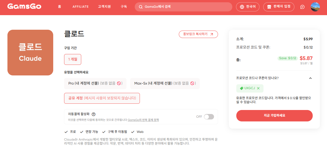 | 모든 구독 서비스 적용 가능한 🎁겜스고 프로모션 할인코드 UXGCJ |