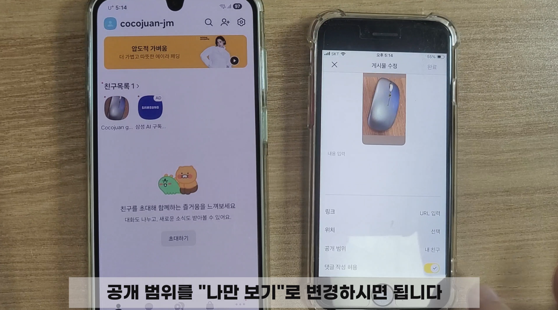 - ‘새 게시물’ 작성 → 공개 범위를 ‘나만 보기’로 선택 → 등록.