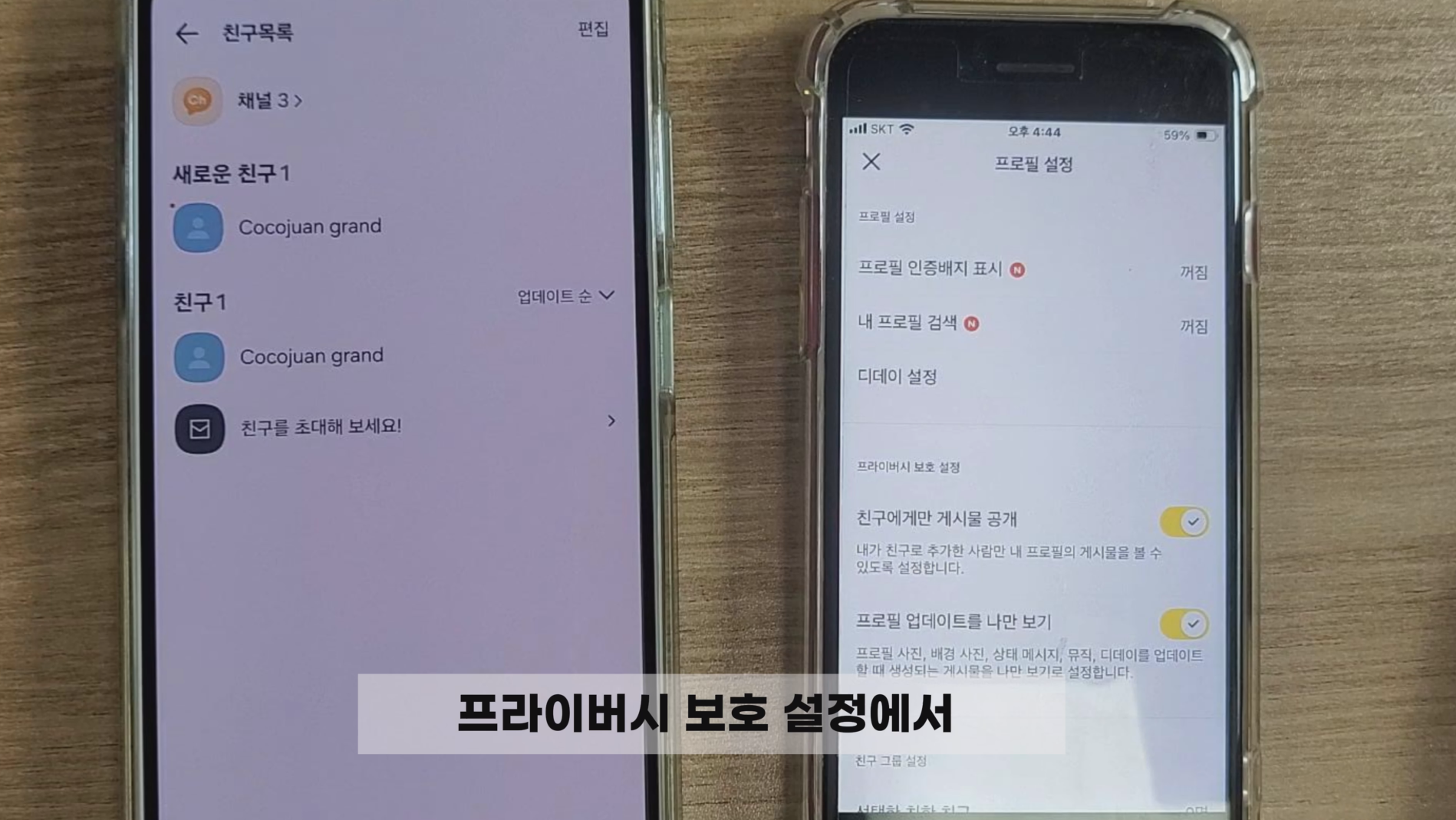- ‘친구에게만 게시물 노출’과 ‘프로필 업데이트 나만 보기’를 모두 켜기(노란색) 로 변경합니다.