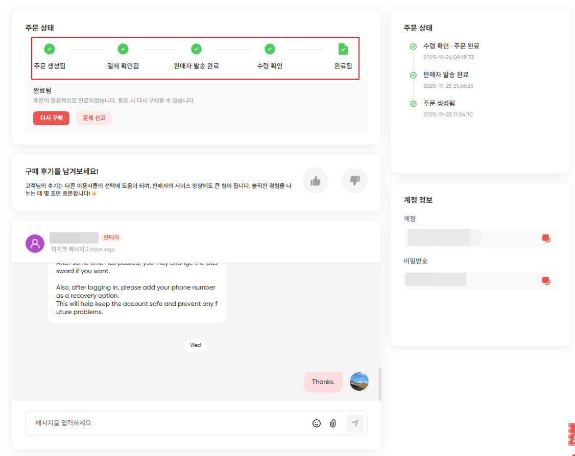 (5) 문제가 생겼을 때, 판매자와 채팅을 쉽게 해결할 수 있습니다. 저는 6시간 만에 해결 됐습니다.