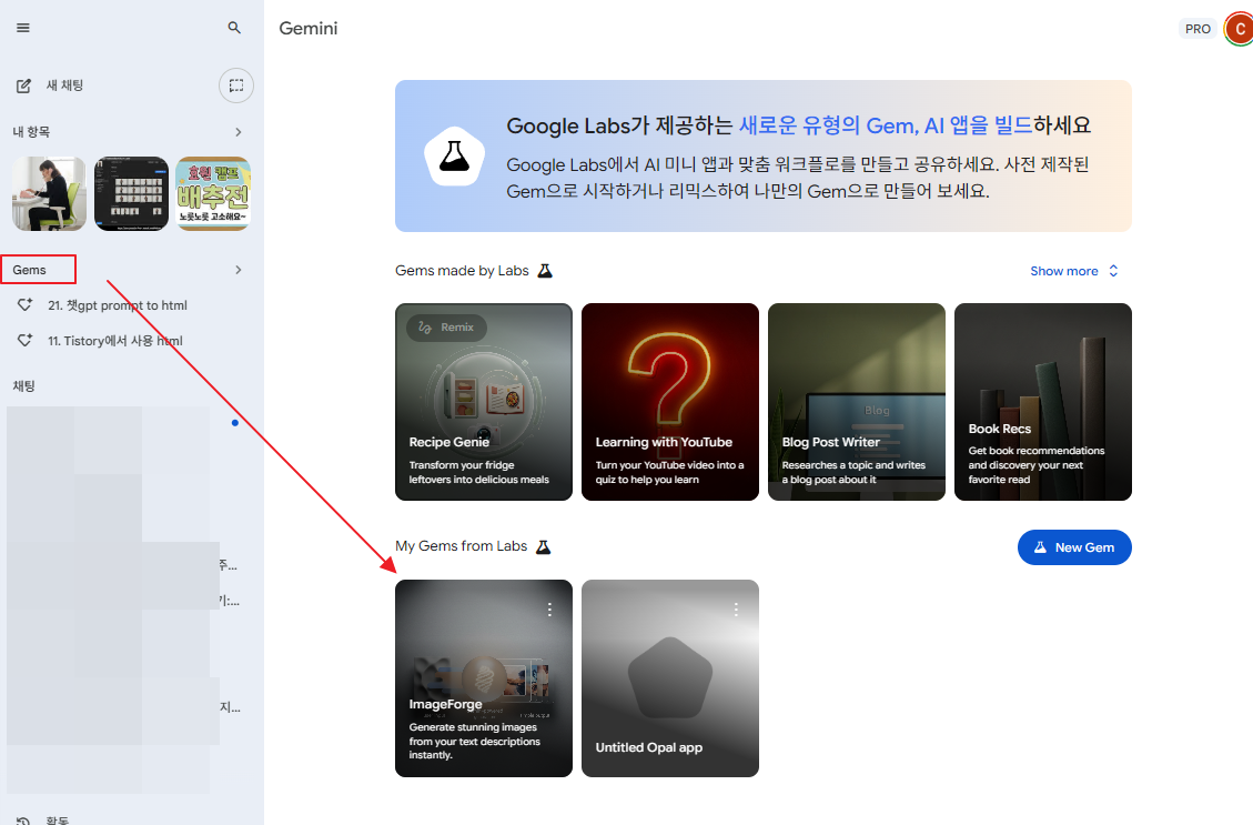 (2) 상단에 My Gems from labs에서 내가 만든 OPAL 앱을 사용할 수 있습니다.