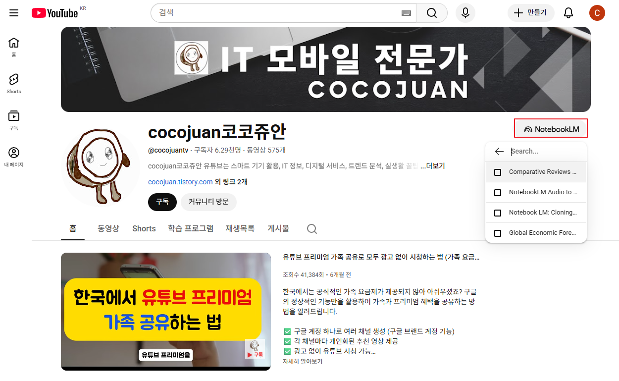 (2) 채널명 옆에 'NotebookLM' 아이콘을 클릭합니다.