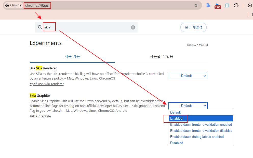 (2) Skia Graphite가 Enabled로 변경 됐는지 확인하면 됩니다.
