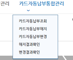 | "계좌자동이체통합관리" 탭 | "카드자동납부통합관리" 탭 |