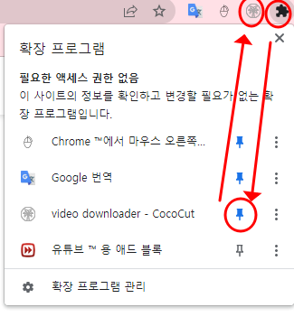(3) 주소창에서 퍼즐 아이콘을 클릭해, 리스트에서 'video downloader-cococut' 핀을 눌러 주소창에 활성화합니다.